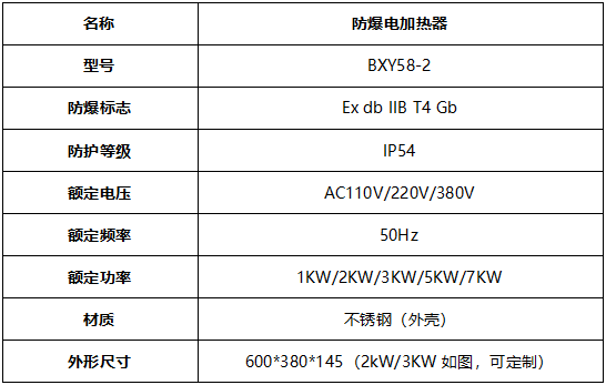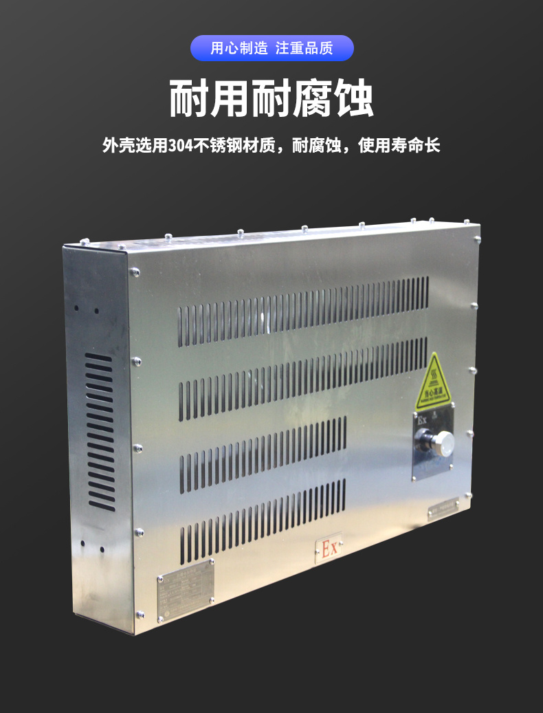 1、本列產品防爆空間加熱器的一種,其腔體內有電加熱板,外殼不銹鋼,通過散熱向空間發(fā)熱量,達到取暖效果。